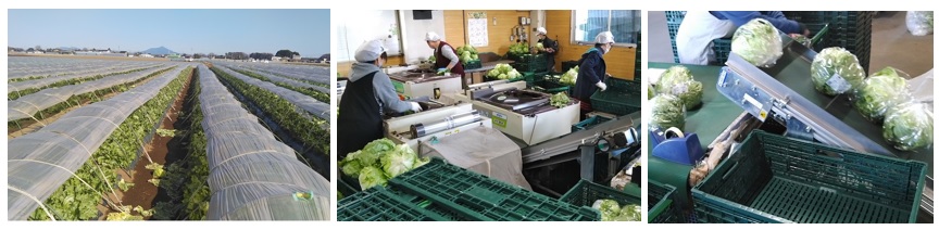 レタスの出荷が最盛期です。左から、「圃場」「包装の様子」「ラップに詰まれてどんどん流れてきます」