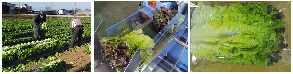 サニーレタス・グリーンリーフ(カール)の出荷量が増えてきました。左から、「カールの収穫」「サニーの包装の様子」「サニーの少量パッケージ」